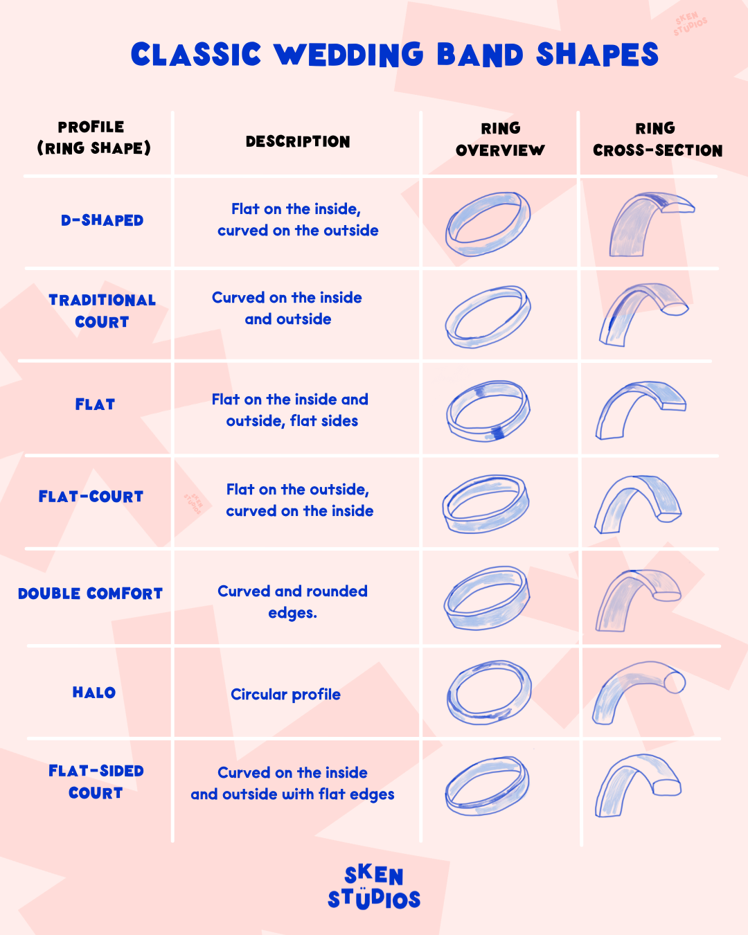 See the table for our most popular wedding band shapes. This is not a comprehensive guide; we love to create wiggly shaped and organic bands too.