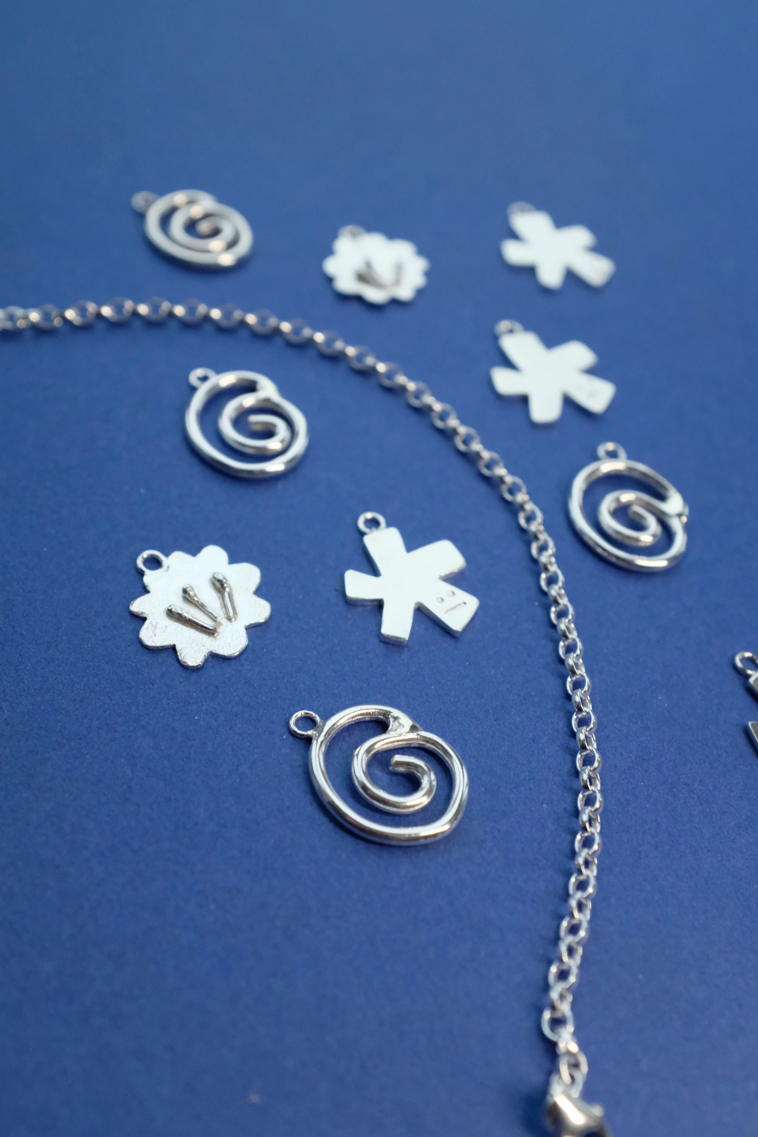 Icons only. Three handmade charms, inspired by our Sken shapes: the spiral, flower and chunky star. Each charm has tiny little details, such as the 3D stamen on the flower and our signature Sken grumpy face, stamped on the star.